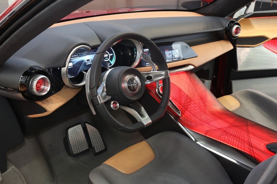 À bord du concept, on remarque tout de suite l'instrumentation 100% numérique, qui pourrait constituer une première chez Alfa. Elle côtoie un écran multimédia plus grand (10,25 pouces) et plus accessible que sur les modèles de série, ce qui pourrait signifier qu'il serait tactile mais rien n'est encore sûr aujourd'hui. Les aérateurs accueillent en leur centre l'affichage numérique de la température. Pour le reste, la planche de bord mélangeant plastique et bois est particulièrement épurée et fluide avec un double bossage au niveau de l'instrumentation. Quasiment pas de boutons non plus sur la console centrale, qui se pare pour l'occasion, comme les contre-portes, d'une teinte rouge.